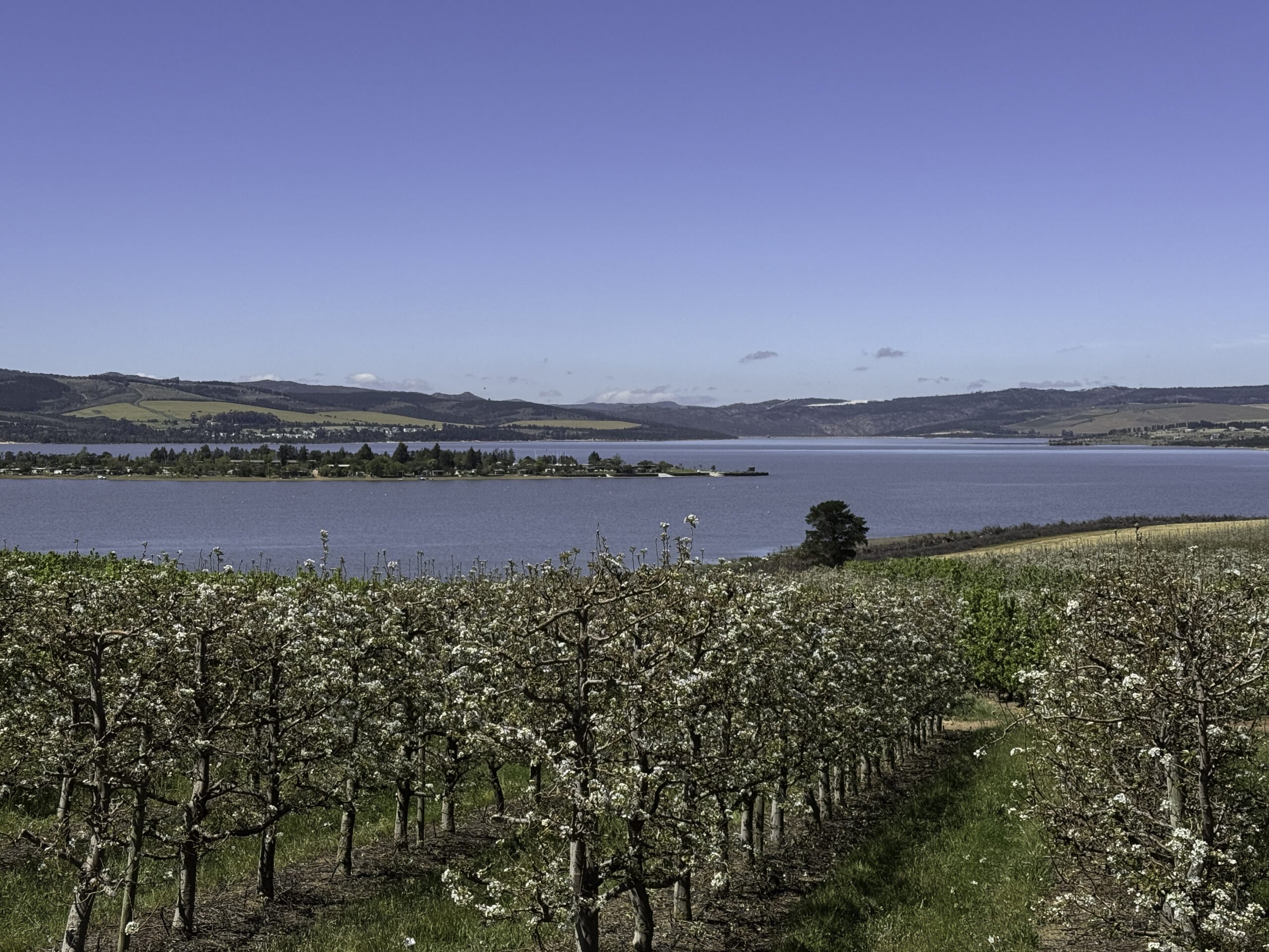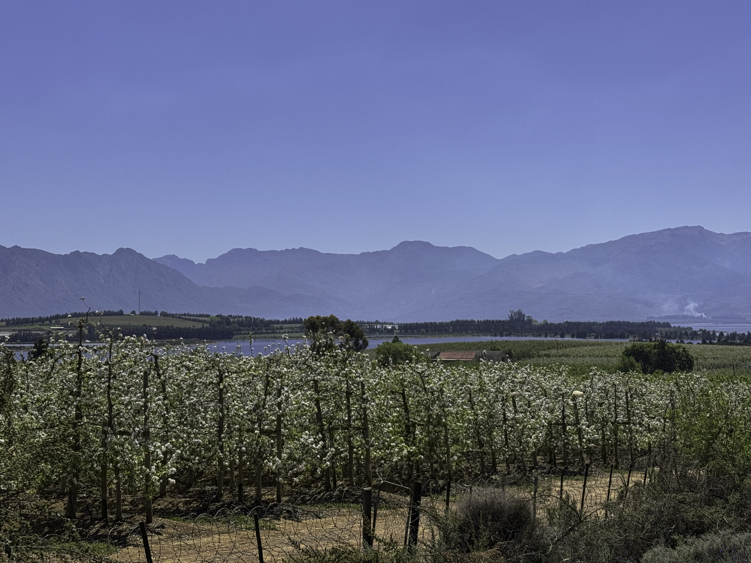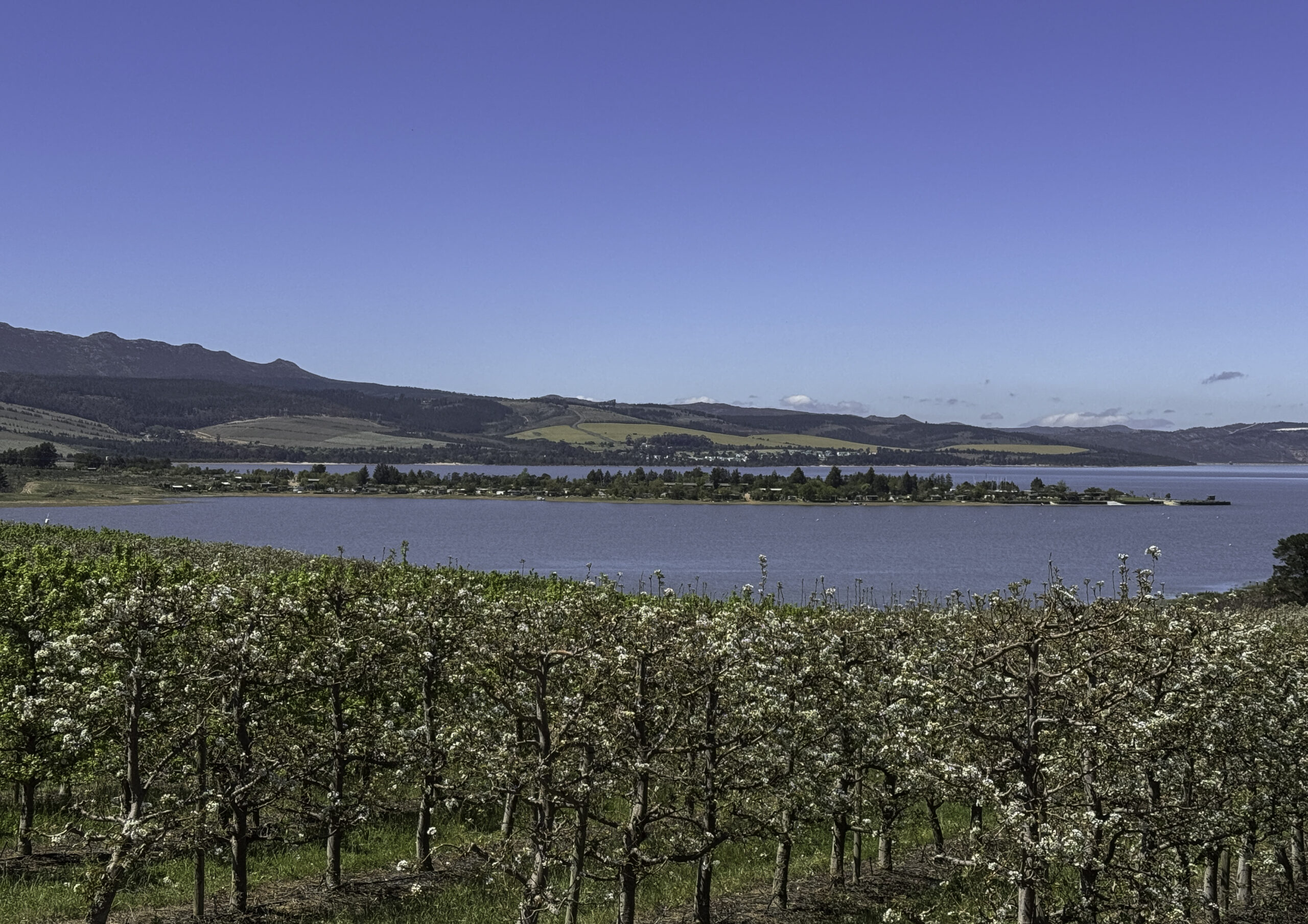 The micro-climate of the valley drastically changed with the building of the Theewaterskloof Dam in the 1970s. Thus, the Villiersdorp Valley changed its face from mainly grain farming (as in most of the Overberg) to the production of deciduous fruit (apples, pears) and viticulture (wine production).